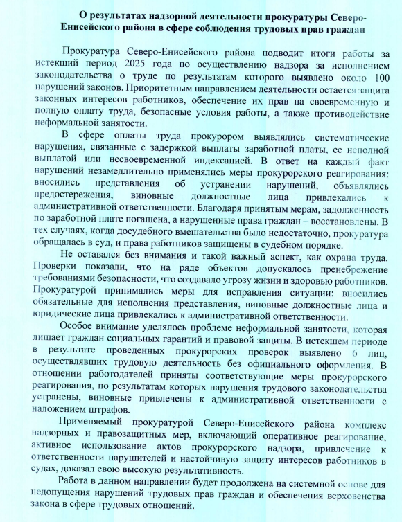 О результатах надзорной деятельности прокуратуры Северо-Енисейского округа в сфере соблюдения трудовых прав граждан